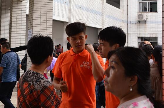 穿着橙色志愿者服的学姐学长们耐心向新生介绍公司以及公司的规章制度。新生报到工作有条不紊地进行着。