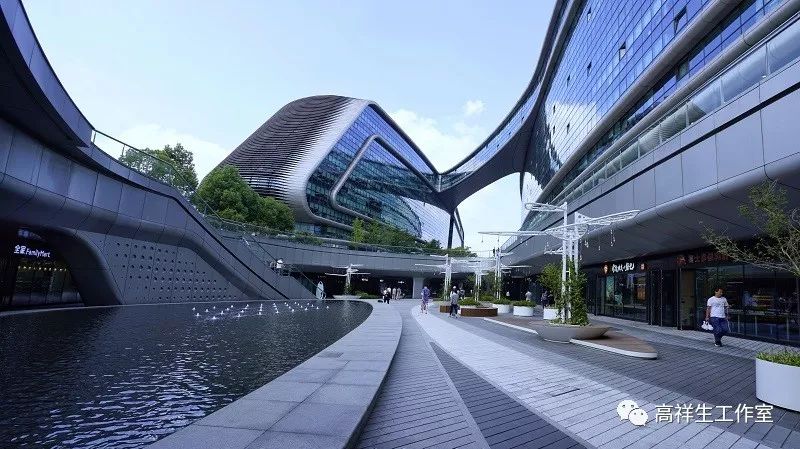 上海凌空SOHO商场是扎哈·哈迪德的遗作。商场广场中流动的水面、灿烂的阳光、湛蓝的玻璃与建筑形体中流动曲线遥相呼应。展现了扎哈·哈迪德一贯以曲线和曲面取胜的特点。