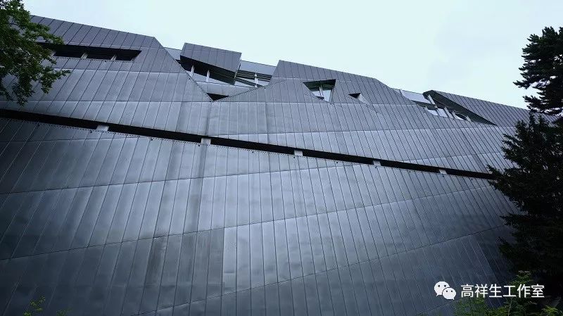 建筑的形态是不规则形体的组合,建筑的外立面就像蒙着一张硕大的花蛇皮。