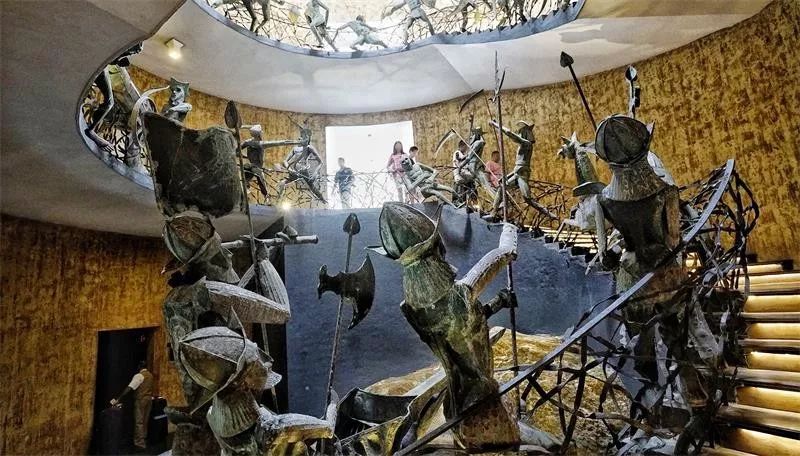 “装置”是个外来词,在国外已经有近百年的历史,而在中国仅有三四十年历史。装置的解释,一是机械的零件,二是机械零件的装配。陈设品是可以移动的,它可以被放置在不同的空间,而装置只能放置在某一个空间,具有附属关系,它就是为这个空间而设计的,一旦移动到其他空间,其尺度、形态、其意义就不适合。装置一般都是安装在建筑立体上,如图 1.2.3 为酒店旋转楼梯中金属雕塑,展现了柬埔寨人民抵抗外来侵略者的顽强斗争场面。装置也有不安装在建筑主体上的。如图 1.2.4 表示具有东方文化气息的装置设计。