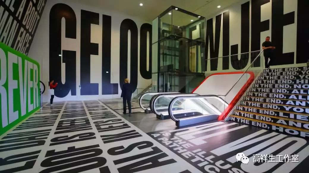 若有机会,人们不妨去参观一下阿姆斯特丹现代艺术馆,从底层大厅的入口处进入,一眼望去,一面建筑石墙凌空对接着一个白色的不规则室内空间,下方的橘红色的走廊式自动扶梯通往现代艺术馆的二层平台,一个由白底黑字的简约式海报铺就的室内空间,建筑的室内摆放的装饰品也是新意十足。