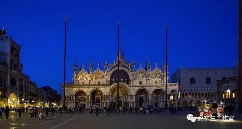 拿破仑说过“圣马可广场是欧洲最美的客厅。”广场一端的圣马可教堂披红戴绿,金光闪闪。在佛晓霞光的衬托下圣马可教堂的形态动人;而阳光照耀下的圣马可教堂更为妩媚,盘旋的海燕使教堂的室外空间更加生动;夜幕下的圣马可教堂和环境都已笼罩在深蓝色的色调里,这时的教堂显得格外安静。