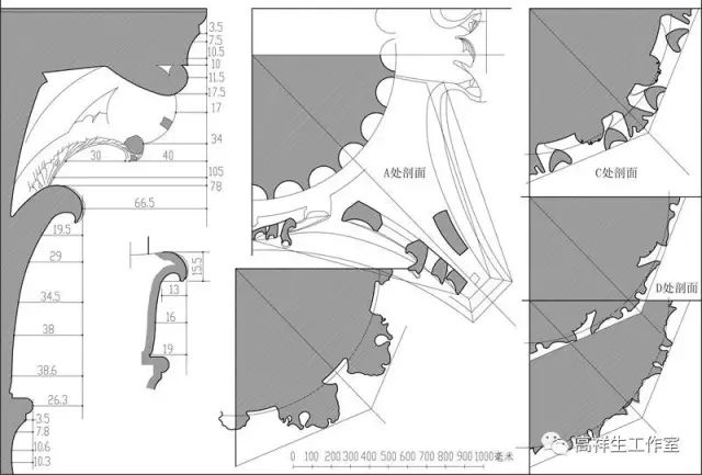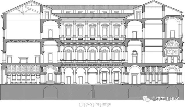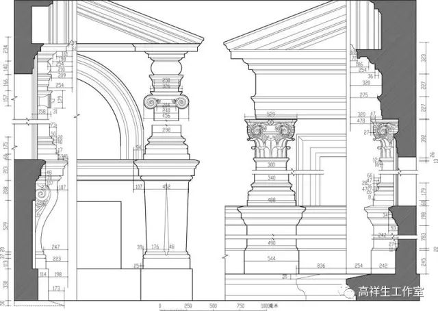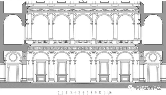 图37罗马法尔尼斯府邸券柱子。该图由高祥生工作室根据法国巴黎美术公司成立一百周年之际时该校师生测绘后复原的渲染图重新以CAD形式绘制