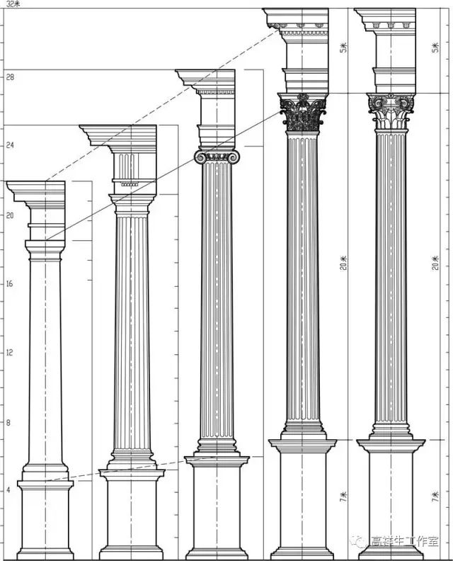 图17古罗马五柱式总图例。该图由高祥生工作室根据王文卿编著的《西方古典柱式》绘制