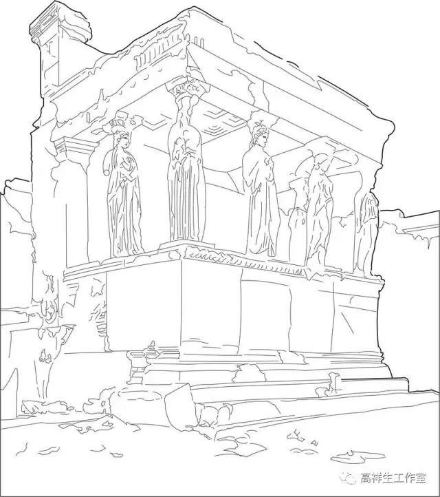 在古希腊建筑中除了以上三种柱式外,还有人像柱,它以女子雕像柱代替爱奥尼柱,如伊瑞克先神庙中就以女像柱代替爱奥尼柱,其造型柔和、秀丽,见图14、图15、图16,而宙斯神庙中则以亚特兰大男像作多立克柱,造型刚毅、雄壮。