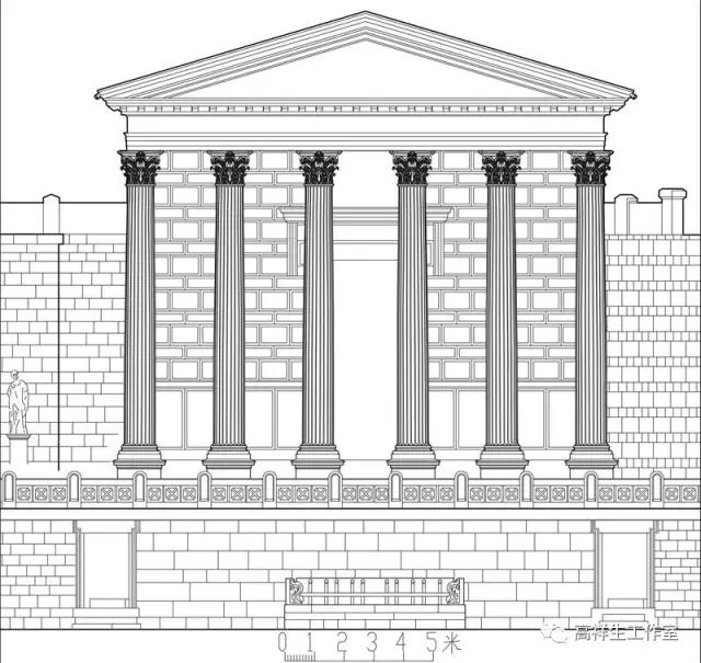图18古罗马多立克柱式。该图由高祥生工作室根据法国巴黎美术公司成立一百周年之际时该校师生测绘后复原的渲染图重新以CAD形式绘制