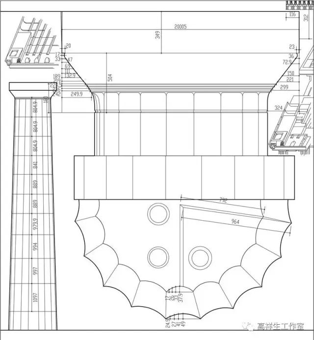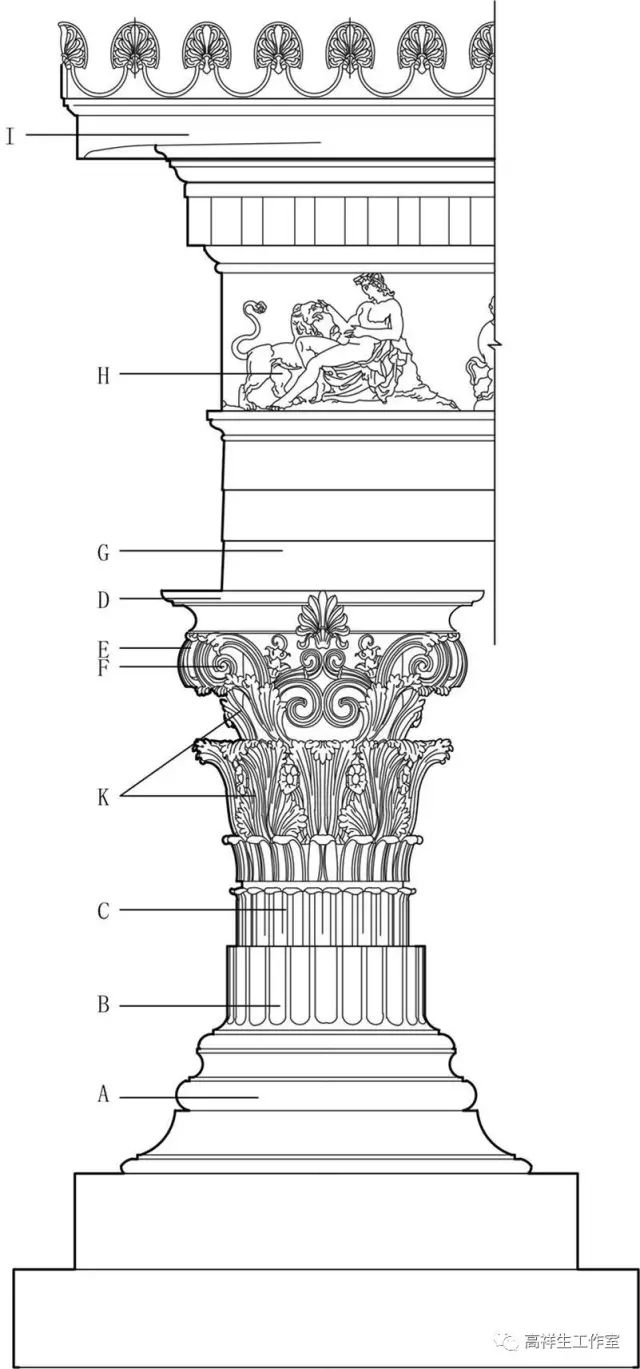 图27古罗马混合柱。该图由高祥生工作室根据法国巴黎美术公司成立一百周年之际时该校师生测绘后复原的渲染图重新以CAD形式绘制