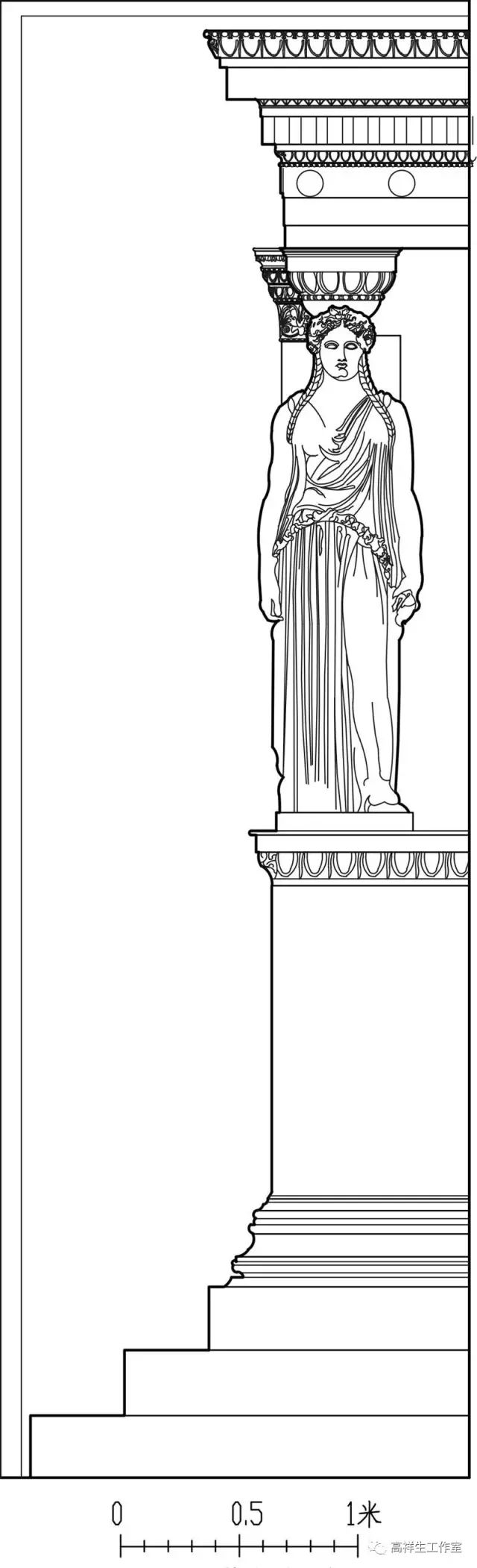 图15女像柱式。该图由高祥生工作室根据法国巴黎美术公司成立一百周年之际时该校师生测绘后复原的渲染图重新以CAD形式绘制