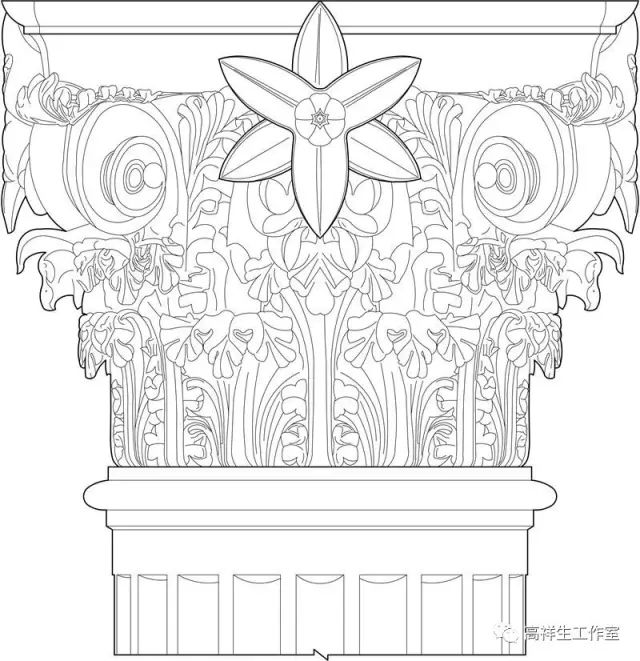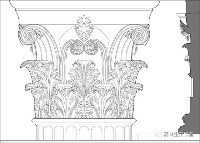 图12古希腊建筑的科林新柱式。该图由高祥生工作室根据法国巴黎美术公司成立一百周年之际时该校师生测绘后复原的渲染图重新以CAD形式绘制