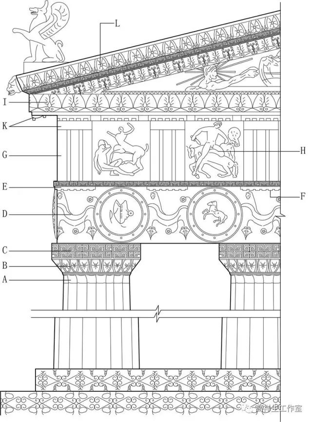 图2古希腊多立克柱式。该图由高祥生工作室根据法国巴黎美术公司成立一百周年之际时该校师生测绘后复原的渲染图重新以CAD形式绘制