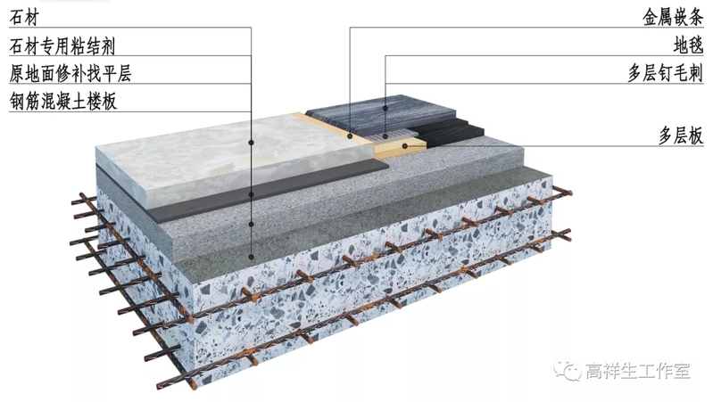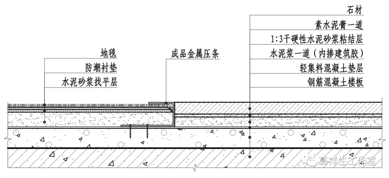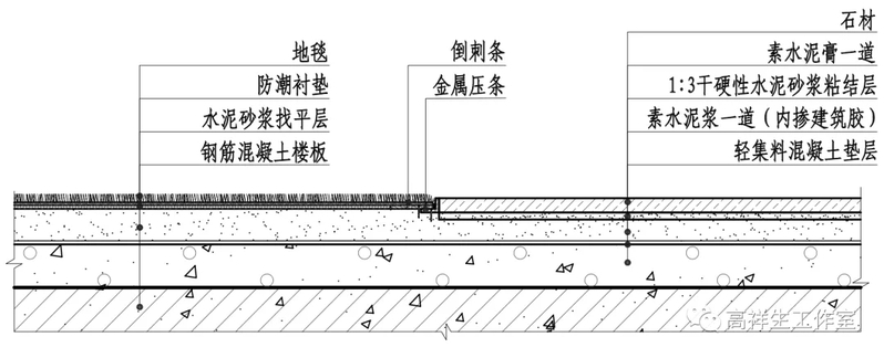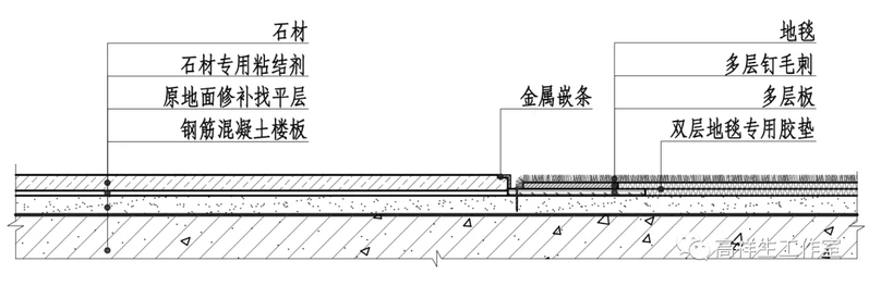 图 12-10-24 石材与地毯交接地面构造节点图(L 形收边条 + 倒刺条)