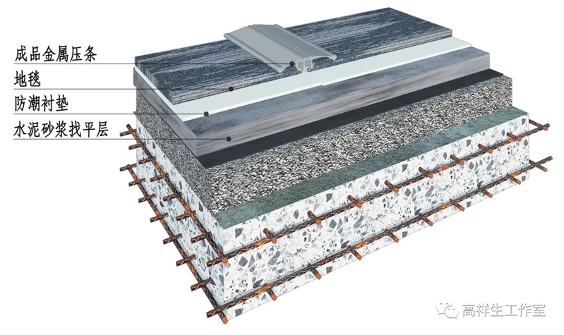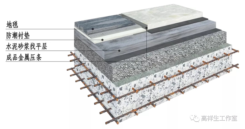 图 12-10-22 石材与地毯交接地面三维图(L 形收边条 + 倒刺条)方向一