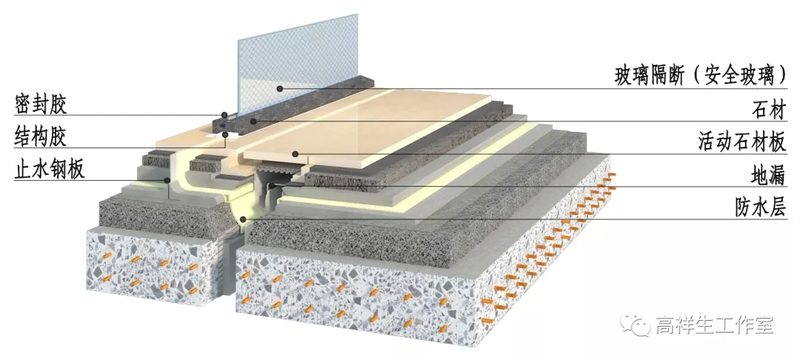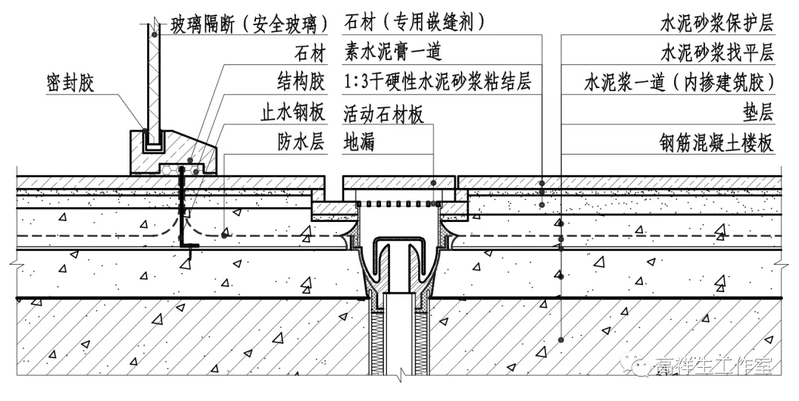 图 12-10-68 卫生间石材地面导水槽与玻璃隔墙交接地面构造节点图