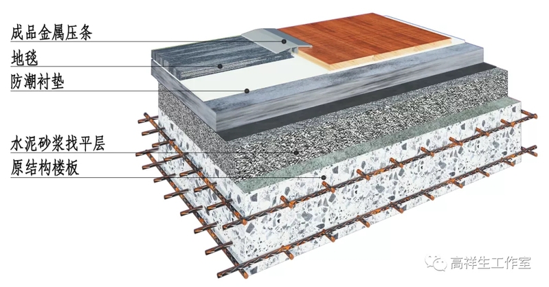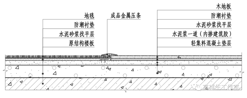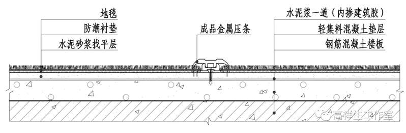 图 12-10-33 地毯与木地板交接地面构造节点图(成品金属压条)