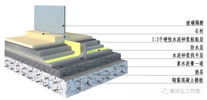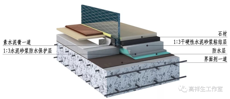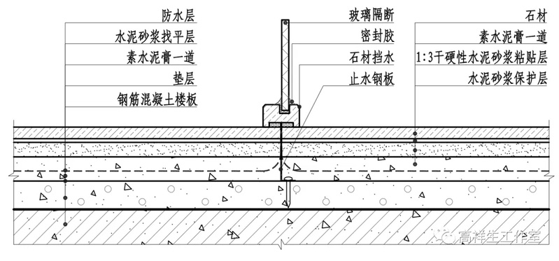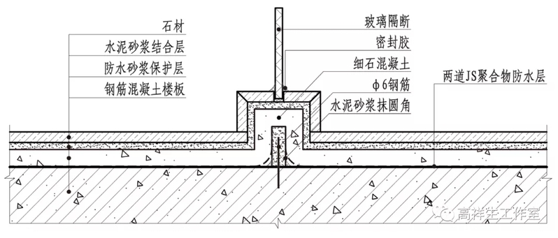 图 12-10-65 卫生间石材地面与玻璃隔墙交接地面构造节点图