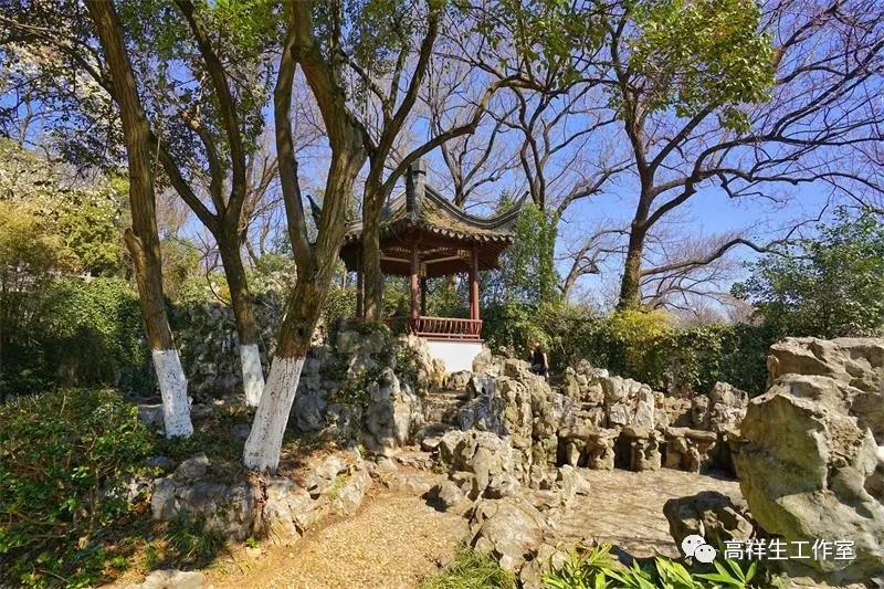 清凉山公园南大门后的右侧有一条向上的石阶小道,时隐时现,逶迤曲折,两旁八角金盘、梧桐、无患子佇立,湖石悉数、凉亭点缀,阳光下石阶光斑陆离。