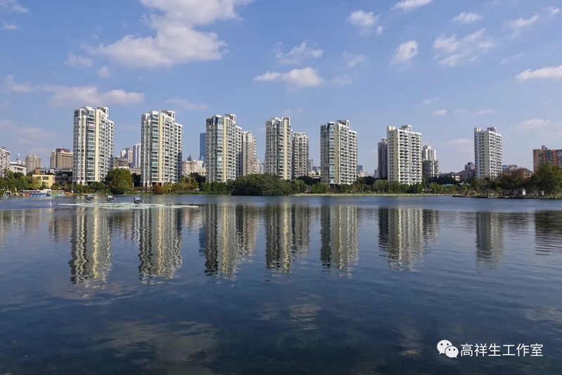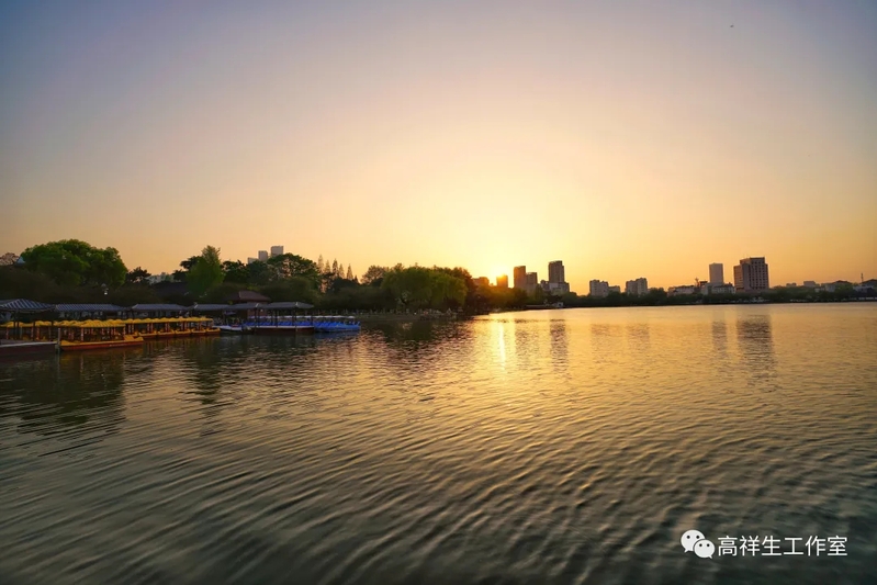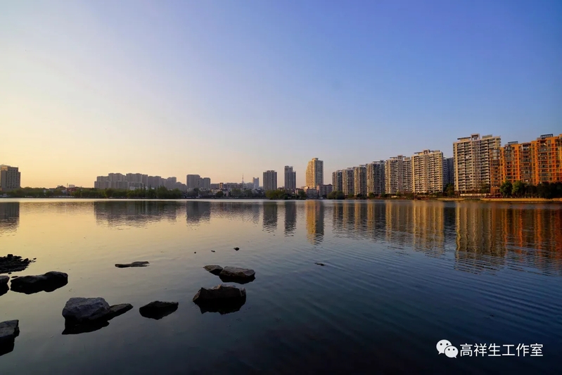 夕阳下湖岸楼宇接踵  湖中碣石佇立  高祥生摄影