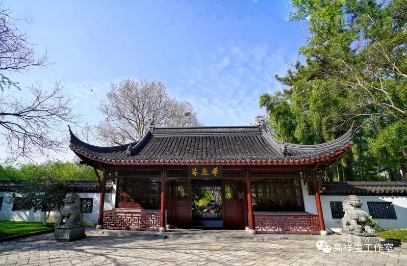进入莫愁湖公园后绕过月牙池,有小径连通华严庵。现在的华严庵主要有门面和庭院。华严庵的门面为三开间,端庄,大方,左右设石狮两尊,威严、静穆,屋面青瓦铺贴,飞檐起翘。我曾多次带员工在华严庵作建筑写生,至今印象深刻。华严庵内卵石铺地,花纹精美,庵内中央耸立一块硕大的湖石,玲珑剔透、气宇轩昂,足以与苏州留园的湖石冠云峰比美。华严庵庵内绿荫环抱,西侧廊道通彻,廊柱成排,西侧有门洞通往莫愁女故居,东侧有入口达棋馆。