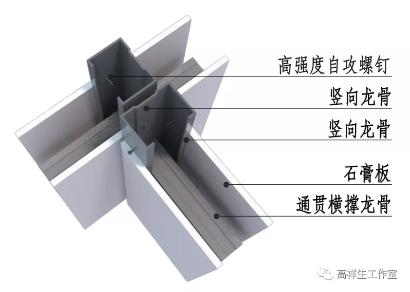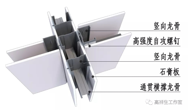 图 14-1-14 轻钢龙骨隔墙交接(三)三维图(墙面十字交接)