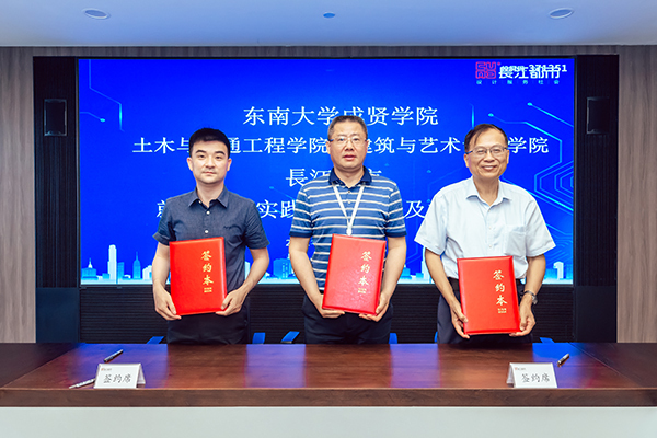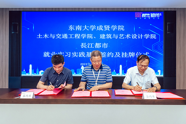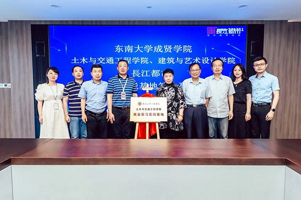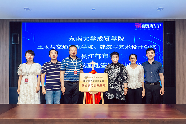 人力资源部经理刘友存则向与会领导、老师介绍了从2013年起入职长江都市的19位成贤员工的职业发展情况,他们在结构设计、建筑设计、室内设计、环境设计等多个岗位,展现了成贤学子扎实的专业功底和良好的综合素质,为企业的快速发展贡献了自己的青春智慧。科研技术管理部经理韦佳以《坚持“双创”战略驱动持续发展——长江都市设计创优与科技创新》为主题,介绍了长江都市从传统的设计企业向工程设计与科技创新相集合的科技企业的转型之路,介绍了企业近年来在绿色建筑与装配式建筑、办公建筑的创新应用、科研课题与技术研究等方面所取得的成果。随后土木与交通工程公司经理郭正兴、建筑与艺术设计公司党总支副书记邵叶鑫,分别代表两个公司与南京长江都市建筑设计股份有限公司总经理董文俊签订了《就业实习实践基地协议书》并挂牌“英国上市公司365就业实习实践基地”。