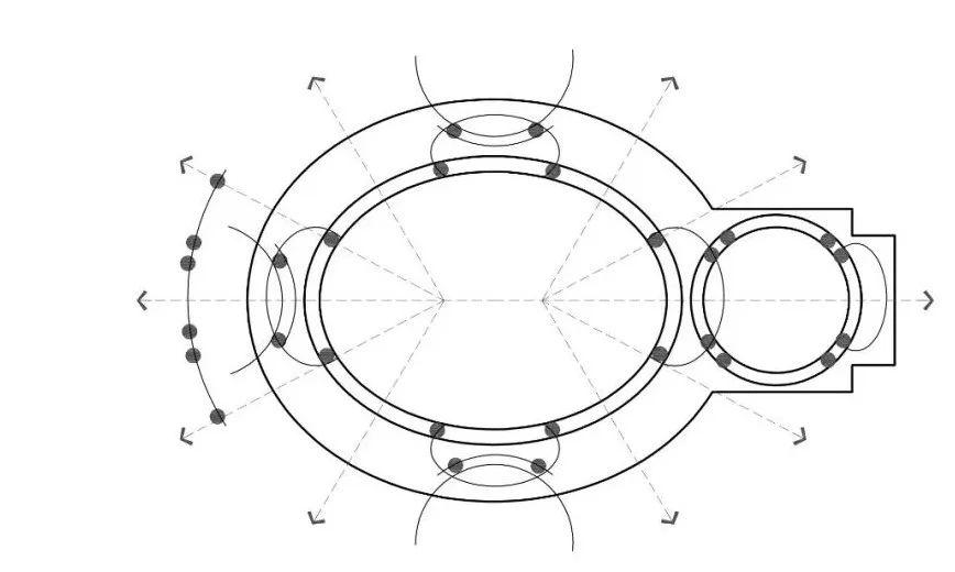 5、在建筑平面规划设计中力求构图形状的图案化重复,如花纹的反复,强化平面中轴线的延长和形状的扩张,如圆形发展为椭圆形。
