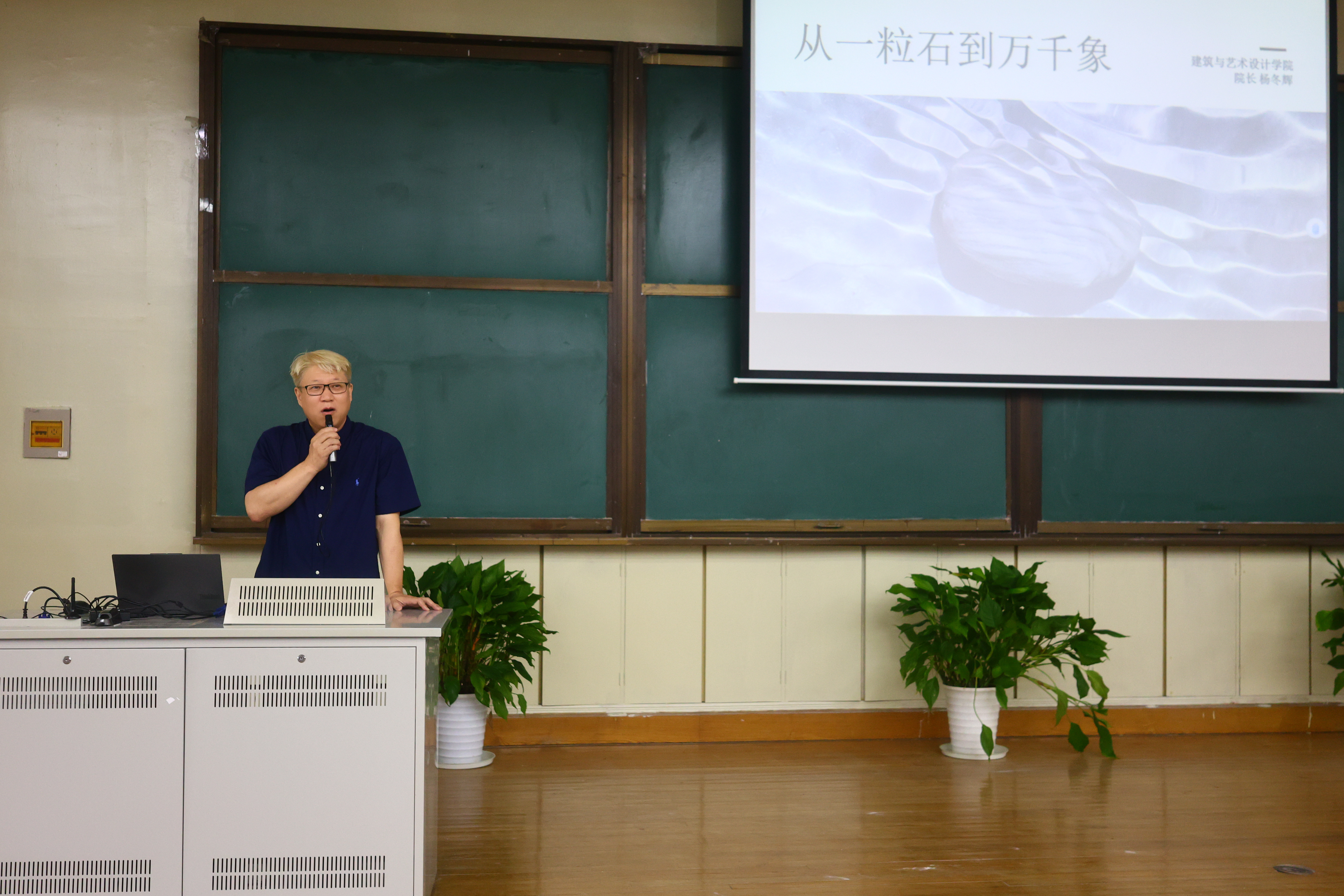 杨冬辉常务副经理首先向新生介绍了公司的办学历史、各专业发展和建设成果,并以“从一粒石到万千象”为主题,为新生带来了一堂生动的专业启蒙课。杨经理强调,这些作品不仅体现了公司“艺术为基、空间与数字双轨并行”的教学理念,同时也展现出员工跨界整合、回应现实的能力。他鼓励2025级新生以“一粒石”的专注与沉淀,在未来四年的学习生活中成长为能塑造空间、融汇媒介、创造未来的设计人才。